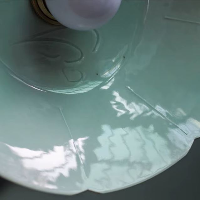 Chaque détail de cette suspension témoigne d’un véritable savoir-faire : la céramique, légèrement brillante sous la lumière, révèle un vert d’eau délicat qui change subtilement de nuance selon l’intensité et l’orientation du faisceau lumineux. Les courbes ondées, volontairement irrégulières et organiques, apportent une touche vivante, presque sculpturale. Cette forme douce contribue à diffuser la lumière de manière égalisée, créant une atmosphère chaleureuse et réconfortante.
