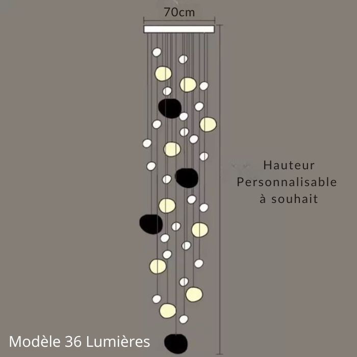 Suspension escalier boule à 36 lumières, modèle majestueux en cascade pour escalier design ou entrée spectaculaire.