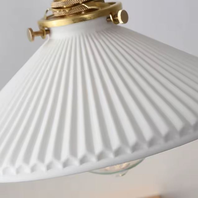 Fabriquée en céramique blanche mate, cette suspension se distingue par son motif godronné régulier, presque architectural, qui rappelle à la fois l’artisanat traditionnel et le design contemporain. Son abat-jour large et parfaitement structuré capte la lumière pour en adoucir l’éclat, tout en donnant à votre espace une présence visuelle raffinée. Associée à une douille en laiton brossé, elle dégage une impression d’authenticité et de sophistication discrète, idéale aussi bien au-dessus d’un plan de travail que dans une chambre ou une entrée au style minimaliste.